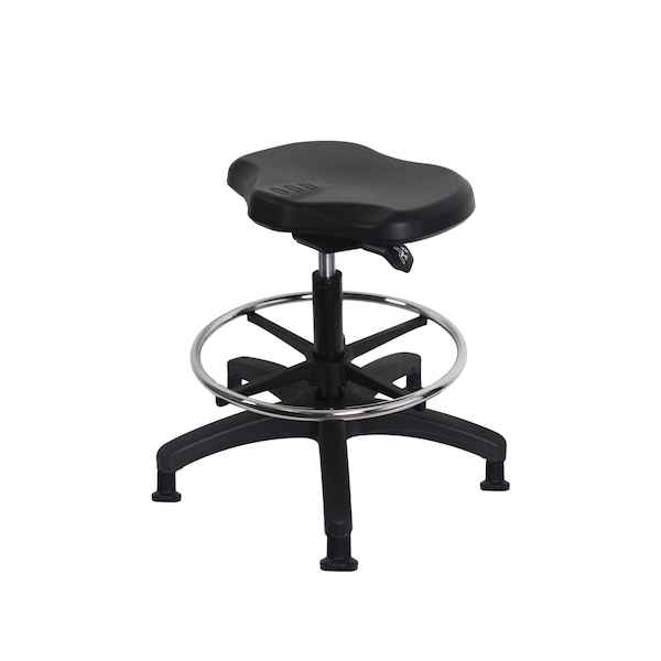 Black Polyurethane Ray Sit-Stand Medium Bench Height Stool is adjustable from 19-26.25 inches from the top of the seat to the floor and features ergonomic adjustments such as seat height and locking seat tilt, chrome adjustable foot ring, and black, nylon-reinforced fiberglass base with stationary, non-marring glides suitable for hard floors in chemical, soil, and puncture resistant polyurethane.