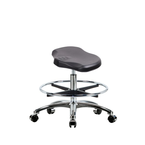 Black Polyurethane Ray Medium Bench Height Stool in Chrome is adjustable from 20-27.5 inches from the top of the seat to the floor and features ergonomic adjustments such as seat height, chrome adjustable foot ring, and cast-aluminum base with chrome-hooded, dual-wheel, self-braking, non-marring casters suitable for hard floors in chemical, soil, and puncture resistant polyurethane.