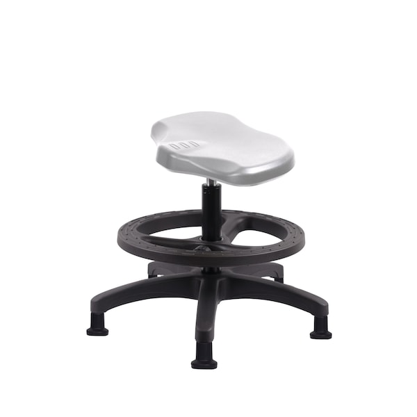 Gray Polyurethane Ray Medium Bench Height Stool is adjustable from 19-26.5 inches from the top of the seat to the floor and features ergonomic adjustments such as seat height, black nylon adjustable foot ring, and black, nylon-reinforced fiberglass base with stationary, non-marring glides suitable for hard floors in chemical, soil, and puncture resistant polyurethane.