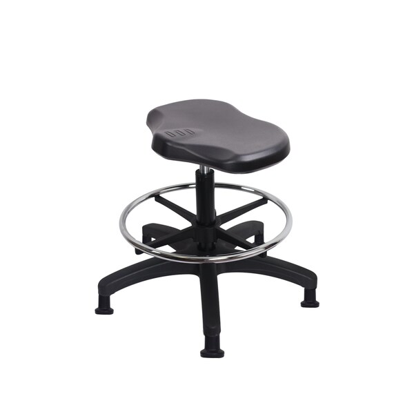 Black Polyurethane Ray Medium Bench Height Stool is adjustable from 19-26.5 inches from the top of the seat to the floor and features ergonomic adjustments such as seat height, chrome adjustable foot ring, and black, nylon-reinforced fiberglass base with stationary, non-marring glides suitable for hard floors in chemical, soil, and puncture resistant polyurethane.