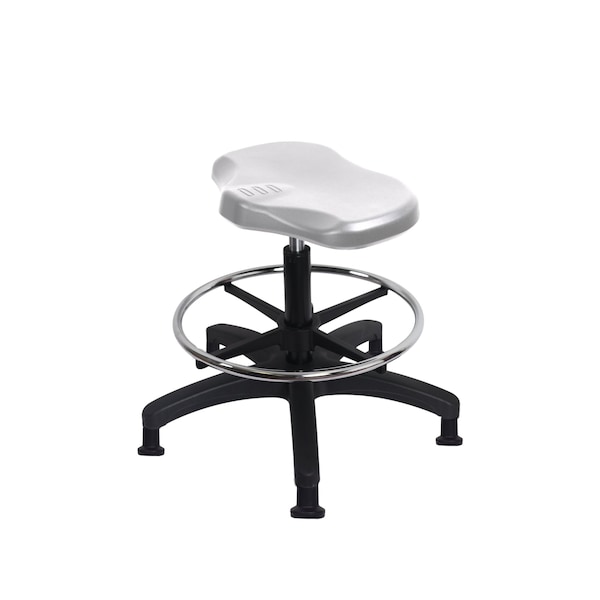 Gray Polyurethane Ray Medium Bench Height Stool is adjustable from 19-26.5 inches from the top of the seat to the floor and features ergonomic adjustments such as seat height, chrome adjustable foot ring, and black, nylon-reinforced fiberglass base with stationary, non-marring glides suitable for hard floors in chemical, soil, and puncture resistant polyurethane.