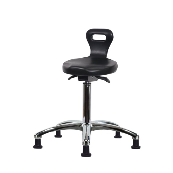 Black Polyurethane Serpent Sit-Stand Medium Bench Height Stool in Chrome is adjustable from 20-28 inches from the top of the seat to the floor and features ergonomic adjustments such as seat height, handle for ease of movement, and locking seat tilt and cast-aluminum base with stationary, non-marring glides suitable for hard floors in chemical, soil, and puncture resistant polyurethane.