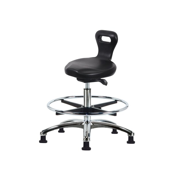 Black Polyurethane Serpent Sit-Stand Medium Bench Height Stool in Chrome is adjustable from 20-28 inches from the top of the seat to the floor and features ergonomic adjustments such as seat height, handle for ease of movement, and locking seat tilt, chrome adjustable foot ring, and cast-aluminum base with stationary, non-marring glides suitable for hard floors in chemical, soil, and puncture resistant polyurethane.