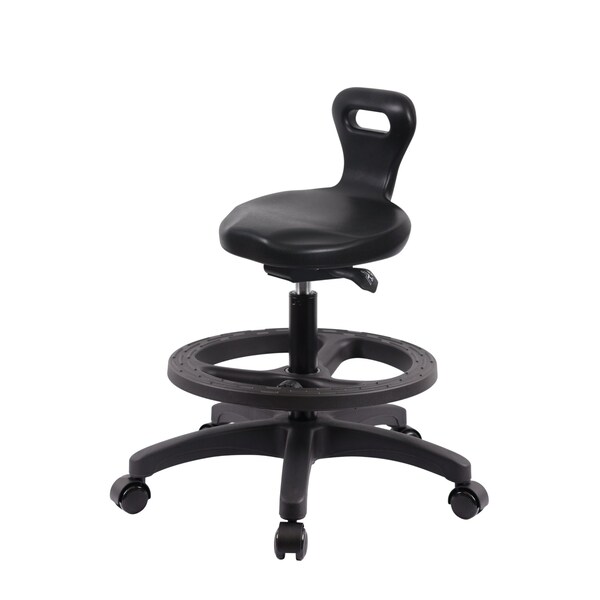 Black Polyurethane Serpent Sit-Stand Medium Bench Height Stool is adjustable from 19-26.25 inches from the top of the seat to the floor and features ergonomic adjustments such as seat height, handle for ease of movement, and locking seat tilt, black nylon adjustable foot ring, and black, nylon-reinforced fiberglass base with dual-wheel, self-braking, non-marring casters suitable for hard floors in chemical, soil, and puncture resistant polyurethane.