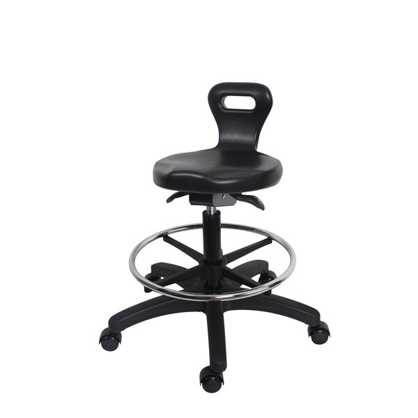 Black Polyurethane Serpent Sit-Stand Medium Bench Height Stool is adjustable from 19-26.25 inches from the top of the seat to the floor and features ergonomic adjustments such as seat height, handle for ease of movement, and locking seat tilt, chrome adjustable foot ring, and black, nylon-reinforced fiberglass base with dual-wheel, self-braking, non-marring casters suitable for hard floors in chemical, soil, and puncture resistant polyurethane.