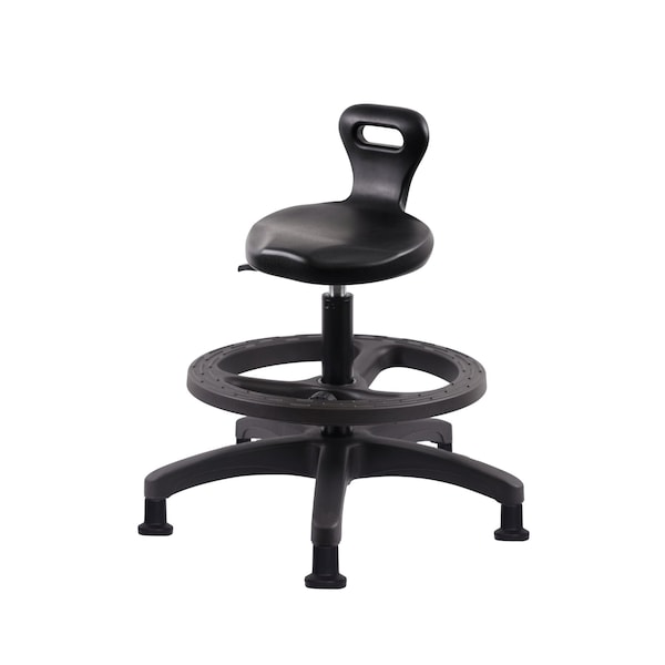 Black Polyurethane Serpent Medium Bench Height Stool is adjustable from 19-26.5 inches from the top of the seat to the floor and features ergonomic adjustments such as seat height, handle for ease of movement, and, black nylon adjustable foot ring, and black, nylon-reinforced fiberglass base with stationary, non-marring glides suitable for hard floors in chemical, soil, and puncture resistant polyurethane.