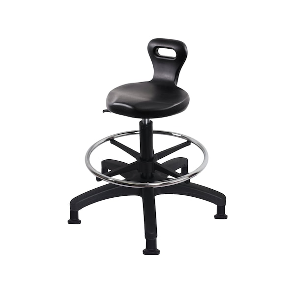 Black Polyurethane Serpent Medium Bench Height Stool is adjustable from 19-26.5 inches from the top of the seat to the floor and features ergonomic adjustments such as seat height, handle for ease of movement, and, chrome adjustable foot ring, and black, nylon-reinforced fiberglass base with stationary, non-marring glides suitable for hard floors in chemical, soil, and puncture resistant polyurethane.