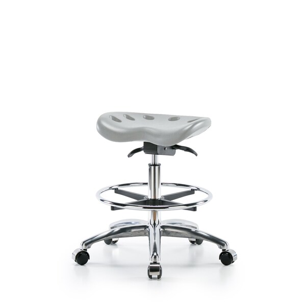 Gray Polyurethane Tractor Sit-Stand Medium Bench Height Stool in Chrome is adjustable from 20-28 inches from the top of the seat to the floor and features ergonomic adjustments such as seat height and locking seat tilt, chrome adjustable foot ring, and cast-aluminum base with chrome-hooded, dual-wheel, self-braking, non-marring casters suitable for hard floors in chemical, soil, and puncture resistant polyurethane.