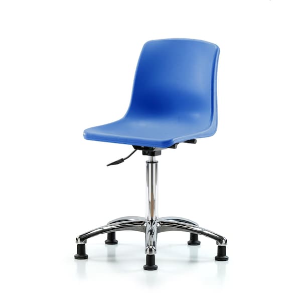 Blue Polypropylene Desk Height Shell Chair in Chrome is adjustable from 18.5-26 inches from the top of the seat to the floor and features seat height adjustment and cast-aluminum base with stationary, non-marring glides suitable for hard floors in heavy-duty polypropylene plastic.