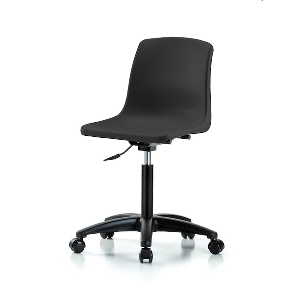 Black Polypropylene Medium Bench Height Shell Chair is adjustable from 18.5-26 inches from the top of the seat to the floor and features seat height adjustment and black, nylon-reinforced fiberglass base with dual-wheel, non-marring casters suitable for hard floors in heavy-duty polypropylene plastic.