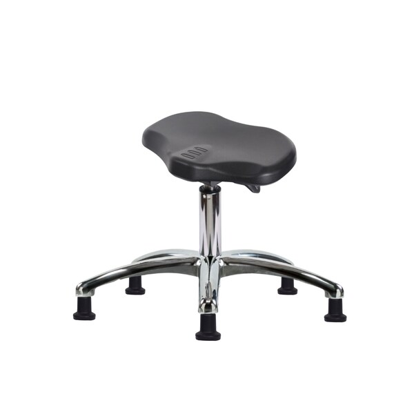 Black Polyurethane Ray Sit-Stand Desk Height Stool in Chrome is adjustable from 17.5-22.5 inches from the top of the seat to the floor and features ergonomic adjustments such as seat height and locking seat tilt and cast-aluminum base with stationary, non-marring glides suitable for hard floors in chemical, soil, and puncture resistant polyurethane.