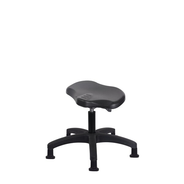 Black Polyurethane Ray Sit-Stand Desk Height Stool is adjustable from 16.5-21.5 inches from the top of the seat to the floor and features ergonomic adjustments such as seat height and locking seat tilt and black, nylon-reinforced fiberglass base with stationary, non-marring glides suitable for hard floors in chemical, soil, and puncture resistant polyurethane.