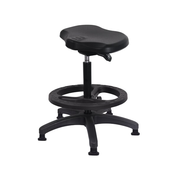 Black Polyurethane Ray Standing Height Sit-Stand is adjustable from 22.5-32 inches from the top of the seat to the floor and features ergonomic adjustments such as seat height and locking seat tilt, black nylon adjustable foot ring, and black, nylon-reinforced fiberglass base with stationary, non-marring glides suitable hard floors in chemical, soil, and puncture resistant polyurethane.