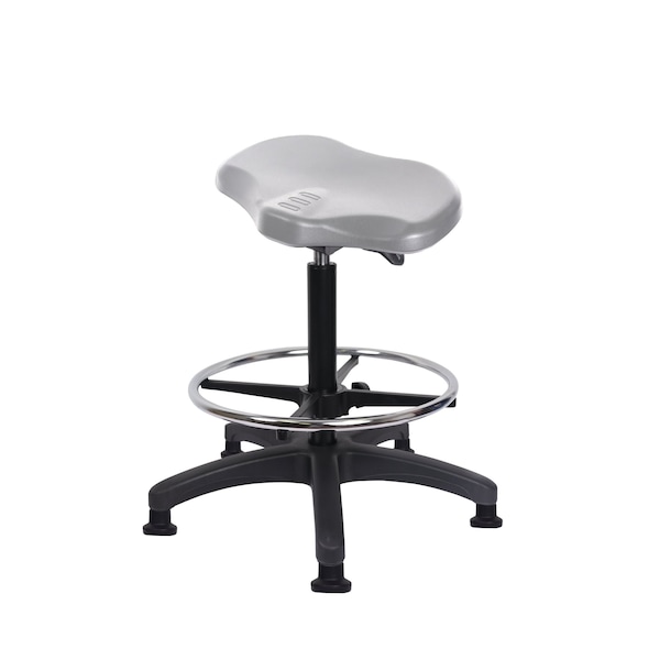 Gray Polyurethane Ray Standing Height Sit-Stand is adjustable from 22.5-32 inches from the top of the seat to the floor and features ergonomic adjustments such as seat height and locking seat tilt, chrome adjustable foot ring, and black, nylon-reinforced fiberglass base with stationary, non-marring glides suitable hard floors in chemical, soil, and puncture resistant polyurethane.