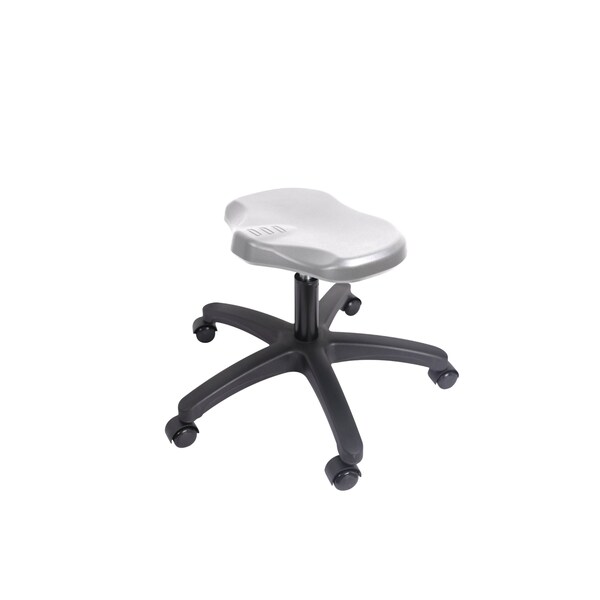 Gray Polyurethane Ray Desk Height Stool is adjustable from 16-21 inches from the top of the seat to the floor and features ergonomic adjustments such as seat height and black, nylon-reinforced fiberglass base with dual-wheel, self-braking, non-marring casters suitable for hard floors in chemical, soil, and puncture resistant polyurethane.