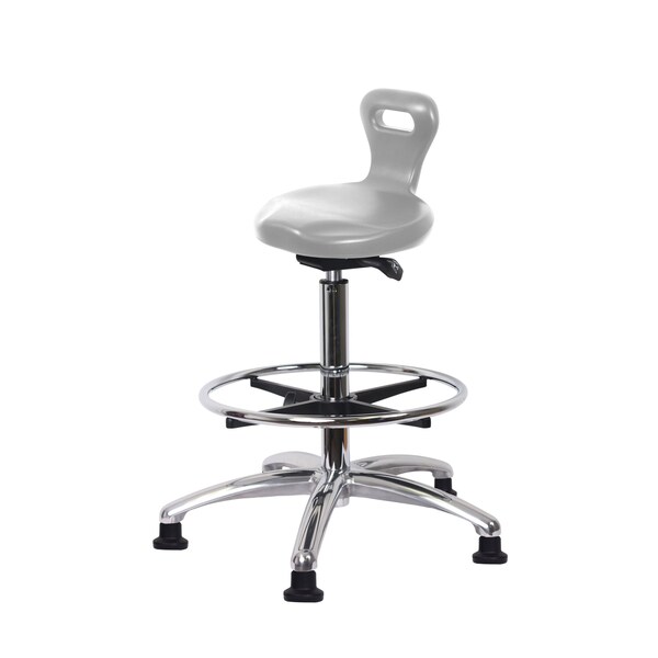 Gray Polyurethane Serpent Standing Height Sit-Stand in Chrome is adjustable from 23-33.5 inches from the top of the seat to the floor and features ergonomic adjustments such as seat height, handle for ease of movement, and locking seat tilt, chrome adjustable foot ring, and cast-aluminum base with stationary, non-marring glides suitable hard floors in chemical, soil, and puncture resistant polyurethane.