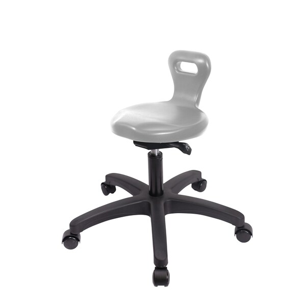 Gray Polyurethane Serpent Sit-Stand Medium Bench Height Stool is adjustable from 19-26.25 inches from the top of the seat to the floor and features ergonomic adjustments such as seat height, handle for ease of movement, and locking seat tilt and black, nylon-reinforced fiberglass base with dual-wheel, self-braking, non-marring casters suitable for hard floors in chemical, soil, and puncture resistant polyurethane.