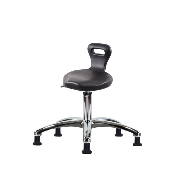 Black Polyurethane Serpent Desk Height Stool in Chrome is adjustable from 17-22 inches from the top of the seat to the floor and features ergonomic adjustments such as seat height, handle for ease of movement, and cast-aluminum base with stationary, non-marring glides suitable for hard floors in chemical, soil, and puncture resistant polyurethane.
