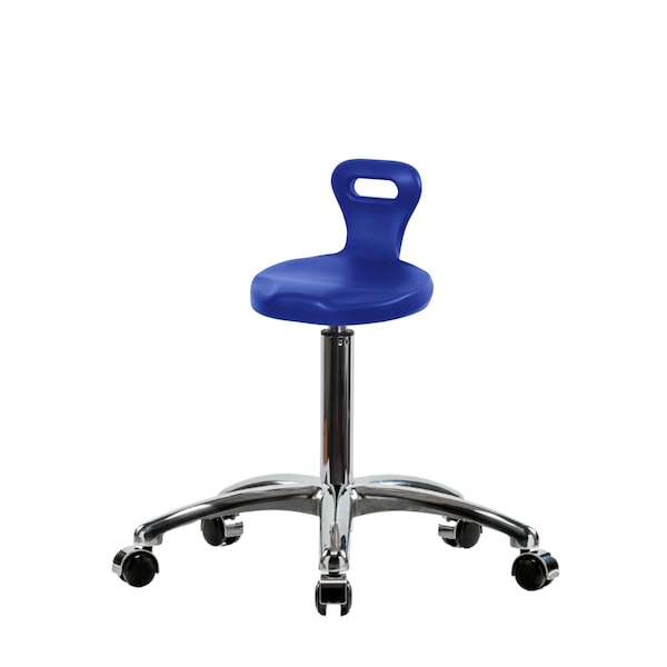 Blue Polyurethane Serpent Medium Bench Height Stool in Chrome is adjustable from 19-26.5 inches from the top of the seat to the floor and features ergonomic adjustments such as seat height, handle for ease of movement, and cast-aluminum base with chrome-hooded, dual-wheel, self-braking, non-marring casters suitable for hard floors in chemical, soil, and puncture resistant polyurethane.
