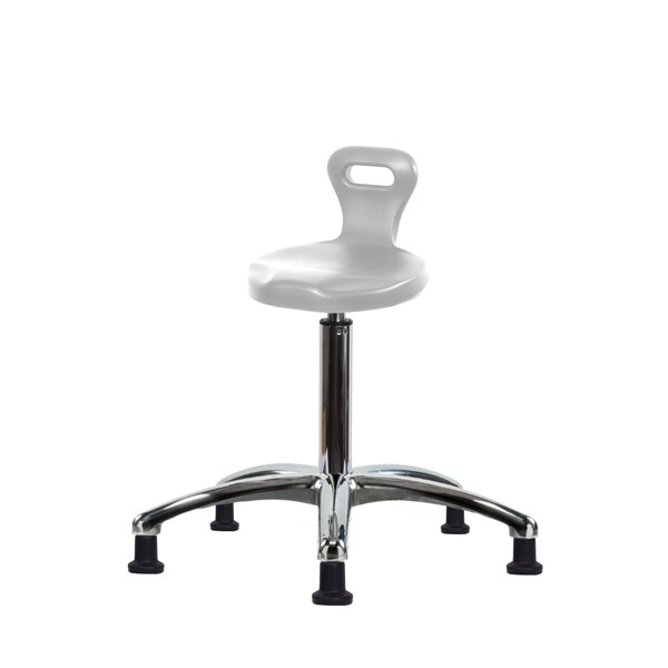 Gray Polyurethane Serpent Medium Bench Height Stool in Chrome is adjustable from 19-26.5 inches from the top of the seat to the floor and features ergonomic adjustments such as seat height, handle for ease of movement, and cast-aluminum base with stationary, non-marring glides suitable for hard floors in chemical, soil, and puncture resistant polyurethane.