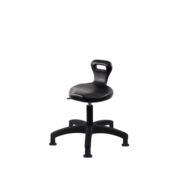 Black Polyurethane Serpent Desk Height Stool is adjustable from 16-21 inches from the top of the seat to the floor and features ergonomic adjustments such as seat height, handle for ease of movement, and black, nylon-reinforced fiberglass base with stationary, non-marring glides suitable for hard floors in chemical, soil, and puncture resistant polyurethane.