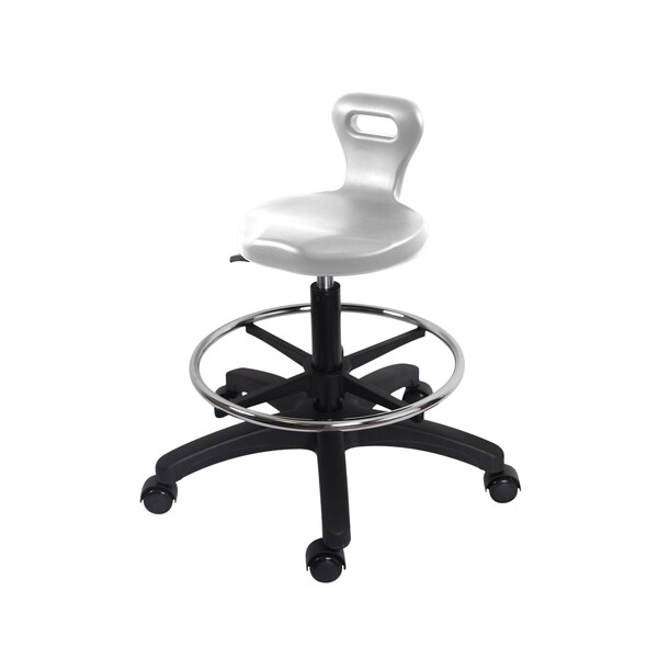 Gray Polyurethane Serpent Medium Bench Height Stool is adjustable from 19-26.5 inches from the top of the seat to the floor and features ergonomic adjustments such as seat height, handle for ease of movement, and, chrome adjustable foot ring, and black, nylon-reinforced fiberglass base with dual-wheel, self-braking, non-marring casters suitable for hard floors in chemical, soil, and puncture resistant polyurethane.