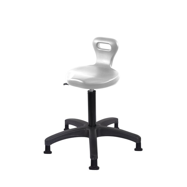 Gray Polyurethane Serpent Medium Bench Height Stool is adjustable from 19-26.5 inches from the top of the seat to the floor and features ergonomic adjustments such as seat height, handle for ease of movement, and black, nylon-reinforced fiberglass base with stationary, non-marring glides suitable for hard floors in chemical, soil, and puncture resistant polyurethane.