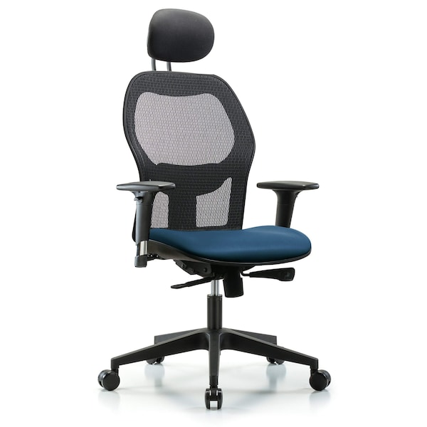 Executive Windrowe Mesh Back Chair is adjustable from 19-23 inches from the top of the seat to the floor and features adjustable lumbar support, comfort molded seat in Marine Blue Supernova Vinyl, 2-way standard adjustable arm rests, headrest, and composite base with dual-wheel casters suitable for carpeted floors.