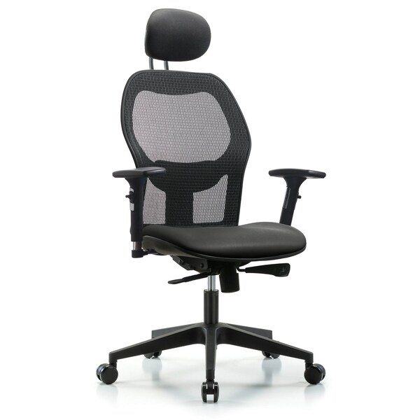 Executive Windrowe Mesh Back Chair is adjustable from 19-23 inches from the top of the seat to the floor and features adjustable lumbar support, comfort molded seat in Carbon Supernova Vinyl, 3D adjustable arm rests, headrest, and composite base with dual-wheel casters suitable for carpeted floors.