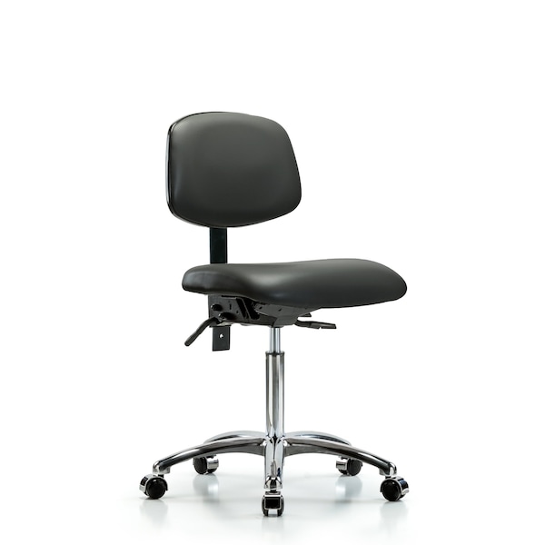 Vinyl Medium Bench Height Chair in Chrome is adjustable from 21.5-29 inches from the top of the seat to the floor and features ergonomic adjustments including seat height and locking back tilt and cast-aluminum base with chrome-hooded, dual-wheel, self-braking, non-marring casters suitable for hard floors in antibacterial/antifungal Carbon Supernova Vinyl.