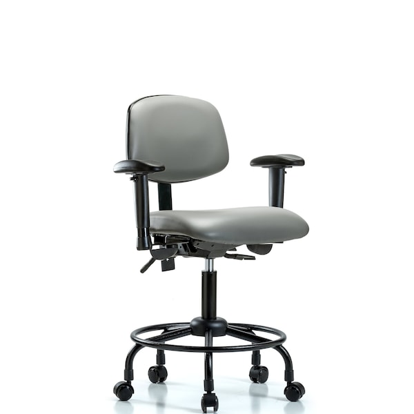 Vinyl Desk Height Chair with Round Tube Base is adjustable from 22.5-27.75 inches from the top of the seat to the floor and features ergonomic adjustments including seat height and locking back tilt, 6-way adjustable arm rests, and black, powder-coated steel base with fixed foot ring and dual-wheel, self-braking, non-marring casters suitable for hard floors in antibacterial/antifungal Sterling Supernova vinyl.