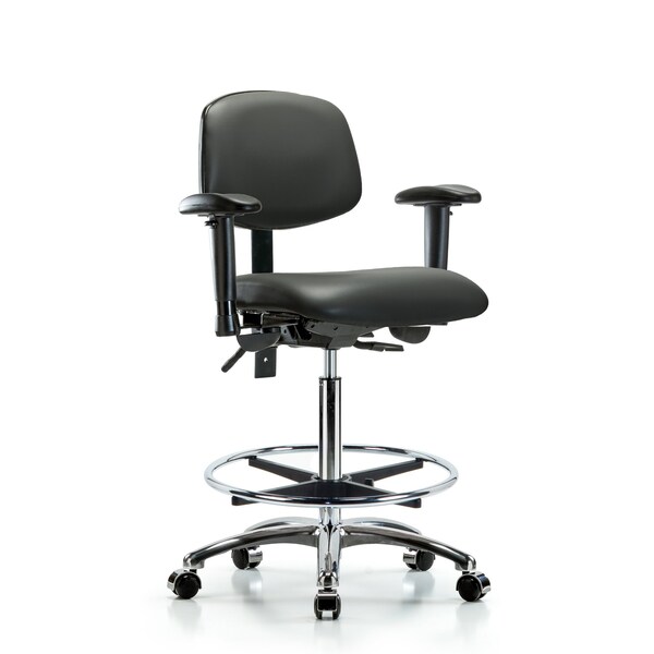Vinyl High Bench Height Chair in Chrome is adjustable from 26.25-36 inches from the top of the seat to the floor and features ergonomic adjustments including seat height and locking back tilt, 6-way adjustable arm rests, chrome adjustable foot ring, and cast-aluminum base with chrome-hooded, dual-wheel, self-braking, non-marring casters suitable for hard floors in antibacterial/antifungal Carbon Supernova Vinyl.