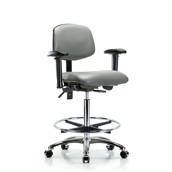 Vinyl High Bench Height Chair in Chrome is adjustable from 26.25-36 inches from the top of the seat to the floor and features ergonomic adjustments including seat height and locking back tilt, 6-way adjustable arm rests, chrome adjustable foot ring, and cast-aluminum base with chrome-hooded, dual-wheel, self-braking, non-marring casters suitable for hard floors in antibacterial/antifungal Sterling Supernova Vinyl.