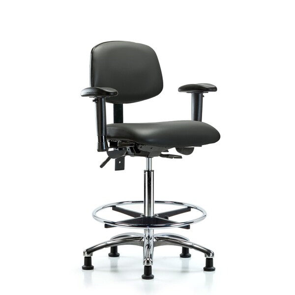 Vinyl High Bench Height Chair in Chrome is adjustable from 26.25-36 inches from the top of the seat to the floor and features ergonomic adjustments including seat height and locking back tilt, locking seat tilt, 6-way adjustable arm rests, chrome adjustable foot ring, and cast-aluminum base with stationary, non-marring glides suitable for hard floors in antibacterial/antifungal Carbon Supernova Vinyl.