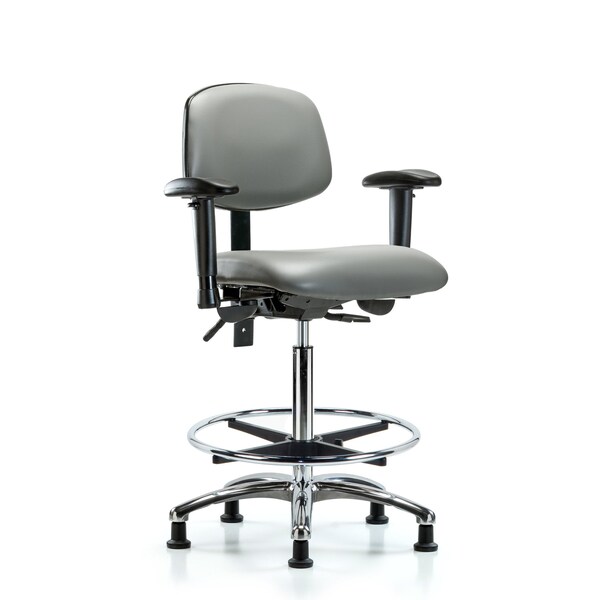 Vinyl High Bench Height Chair in Chrome is adjustable from 26.25-36 inches from the top of the seat to the floor and features ergonomic adjustments including seat height and locking back tilt, locking seat tilt, 6-way adjustable arm rests, chrome adjustable foot ring, and cast-aluminum base with stationary, non-marring glides suitable for hard floors in antibacterial/antifungal Sterling Supernova Vinyl.