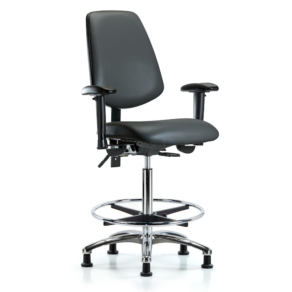 Vinyl High Bench Height Chair with Medium Back in Chrome is adjustable from 26.25-36 inches from the top of the seat to the floor and features ergonomic adjustments including seat height and locking back tilt, 6-way adjustable arm rests, chrome adjustable foot ring, and cast-aluminum base with stationary, non-marring glides suitable for hard floors in antibacterial/antifungal Carbon Supernova Vinyl.