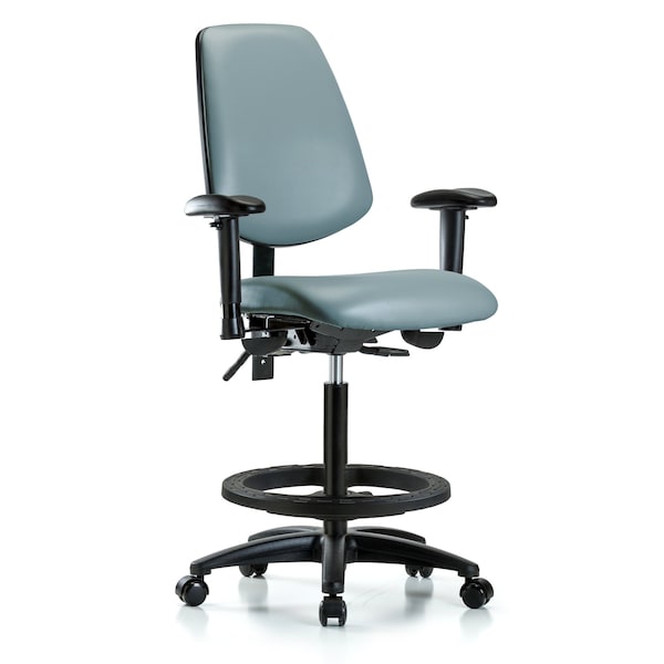 Vinyl High Bench Height Chair with Medium Back is adjustable from 25-34.5 inches from the top of the seat to the floor and features ergonomic adjustments including seat height and locking back tilt, locking seat tilt, 6-way adjustable arm rests, black nylon adjustable foot ring, and black, nylon-reinforced fiberglass base with dual-wheel, self-braking, non-marring casters suitable for hard floors in antibacterial/antifungal Storm Supernova Vinyl.