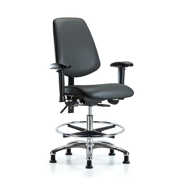 Vinyl Medium Bench Height Chair with Medium Back in Chrome is adjustable from 21.5-29 inches from the top of the seat to the floor and features ergonomic adjustments including seat height and locking back tilt, locking seat tilt, 6-way adjustable arm rests, chrome adjustable foot ring, and cast-aluminum base with stationary, non-marring glides suitable for hard floors in antibacterial/antifungal Carbon Supernova Vinyl.