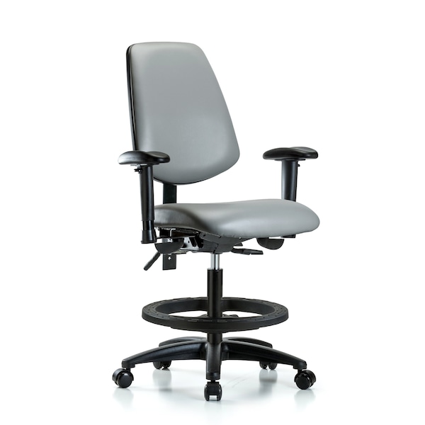 Vinyl Medium Bench Height Chair with Medium Back is adjustable from 21-28.25 inches from the top of the seat to the floor and features ergonomic adjustments including seat height and locking back tilt, 6-way adjustable arm rests, black nylon adjustable foot ring, and black, nylon-reinforced fiberglass base with dual-wheel, self-braking, non-marring casters suitable for hard floors in antibacterial/antifungal Sterling Supernova Vinyl.