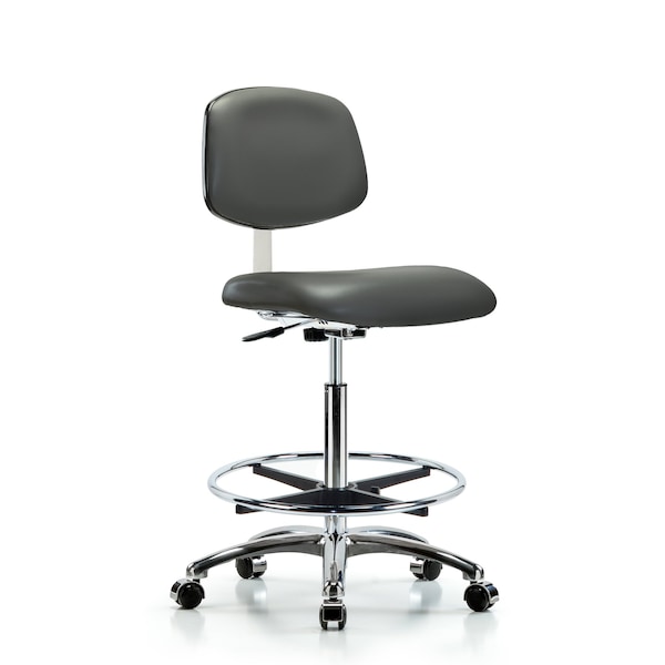 Class 10 Clean Room Vinyl High Bench Height Chair in Chrome is adjustable from 25.75-35.5 inches from the top of the seat to the floor and features manual back height and depth adjustments, chrome adjustable foot ring, and cast-aluminum base with chrome-hooded, dual-wheel, self-braking, non-marring casters suitable for hard floors in antibacterial/antifungal Carbon Supernova vinyl.
