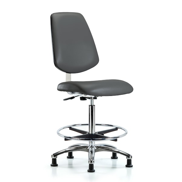 Class 10 Clean Room Vinyl High Bench Height Chair with Medium Back in Chrome is adjustable from 25.75-35.5 inches from the top of the seat to the floor and features manual back height and depth adjustments, chrome adjustable foot ring, and cast-aluminum base with stationary, non-marring glides suitable for hard floors in antibacterial/antifungal Carbon Supernova vinyl.