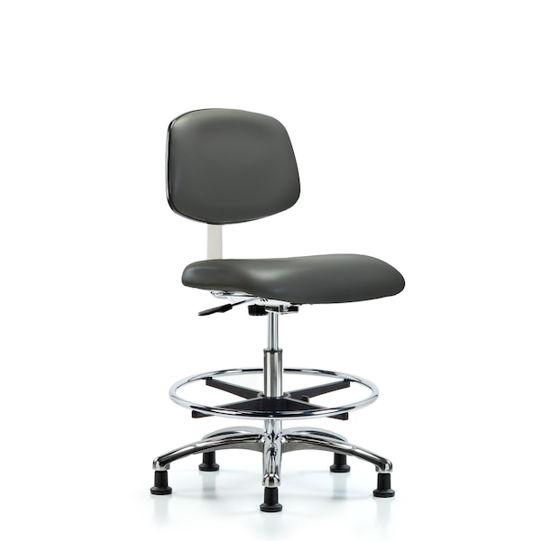 Class 10 Clean Room Vinyl Medium Bench Height Chair in Chrome is adjustable from 21.5-29 inches from the top of the seat to the floor and features manual back height and depth adjustments, chrome adjustable foot ring, and cast-aluminum base with stationary, non-marring glides suitable for hard floors in antibacterial/antifungal Carbon Supernova vinyl.