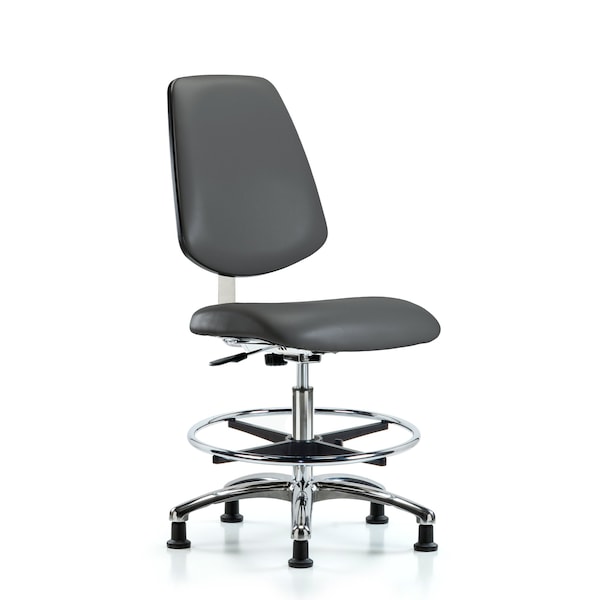 Class 10 Clean Room Vinyl Medium Bench Height Chair with Medium Back in Chrome is adjustable from 21.5-29 inches from the top of the seat to the floor and features manual back height and depth adjustments, chrome adjustable foot ring, and cast-aluminum base with stationary, non-marring glides suitable for hard floors in antibacterial/antifungal Carbon Supernova vinyl.