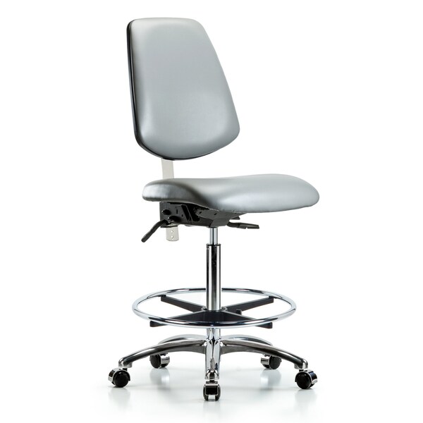 Class 100 Vinyl High Bench Height Clean Room Chair with Medium Back in Chrome is adjustable from 26.25-36 inches from the top of the seat to the floor and features ergonomic adjustments including seat height and locking back tilt, chrome adjustable foot ring, locking seat tilt, and cast-aluminum base with chrome-hooded, dual-wheel, self-braking, non-marring casters suitable for hard floors in antibacterial/antifungal Sterling Supernova Vinyl.