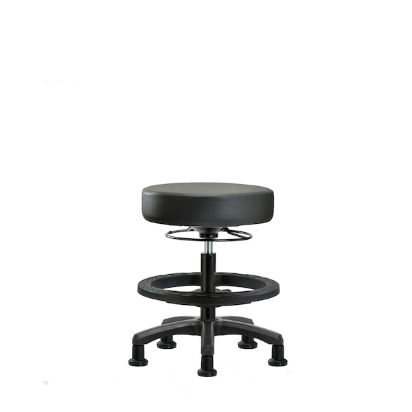 Vinyl Medium Bench Height Mini-Stool is adjustable from 27.75-27.75 inches from the top of the seat to the floor and features ergonomic adjustments, including 360-degree, all-around control, adjustable black foot ring, and black, nylon-reinforced fiberglass base with stationary, non-marring glides suitable for hard floors in antibacterial/antifungal Carbon Supernova vinyl.