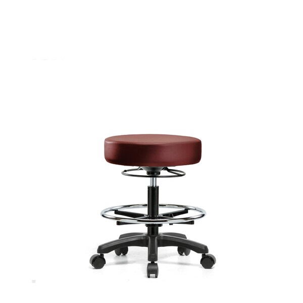Vinyl Medium Bench Height Mini-Stool is adjustable from 27.75-27.75 inches from the top of the seat to the floor and features ergonomic adjustments, including 360-degree, all-around control, adjustable chrome foot ring, and black, nylon-reinforced fiberglass base with dual-wheel, self-braking, non-marring casters suitable for hard floors in antibacterial/antifungal Borscht Supernova vinyl.