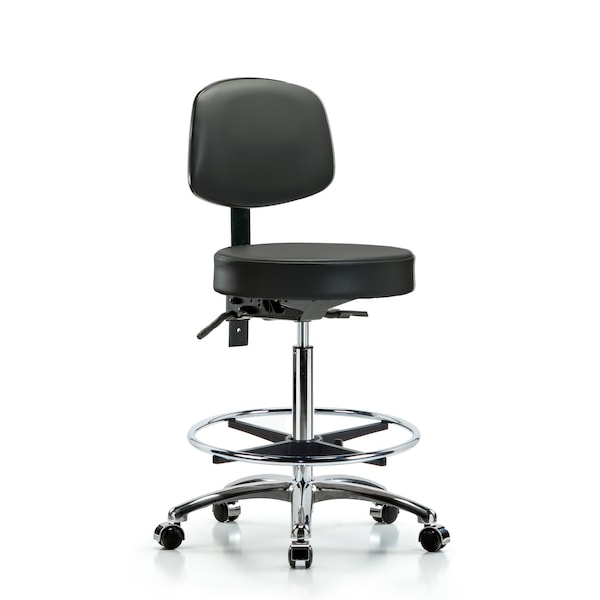 Vinyl Stool, Back, Chrome, High Bench, Tilt, Foot Ring, Casters, Carbon