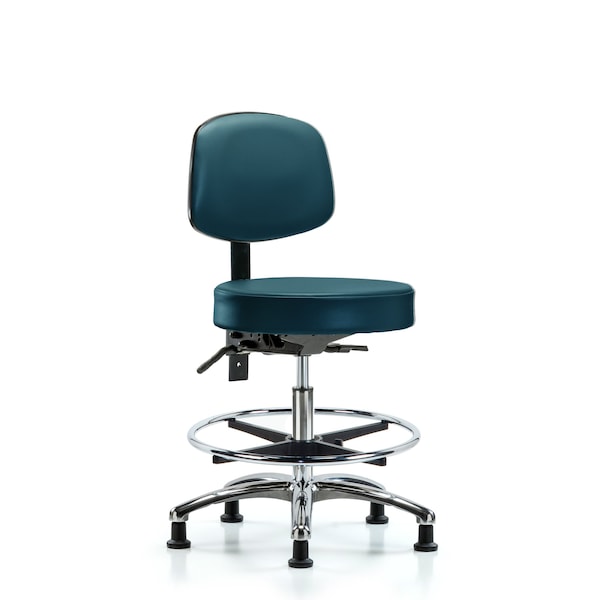 Vinyl Medium Bench Height Stool with Back in Chrome is adjustable from 22-29.75 inches from the top of the seat to the floor and features ergonomic adjustments including seat height and locking back tilt, chrome adjustable foot ring, and cast-aluminum base with stationary, non-marring glides suitable for hard floors in antibacterial/antifungal Marine Blue Supernova Vinyl.