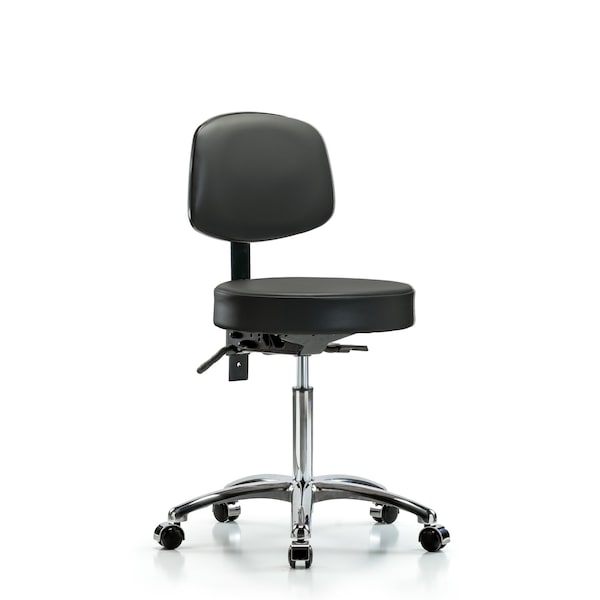 Vinyl Medium Bench Height Stool with Back in Chrome is adjustable from 22-29.75 inches from the top of the seat to the floor and features ergonomic adjustments including seat height and locking back tilt, locking seat tilt, and cast-aluminum base with chrome-hooded, dual-wheel, self-braking, non-marring casters suitable for hard floors in antibacterial/antifungal Carbon Supernova Vinyl.