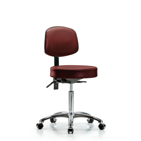 Vinyl Medium Bench Height Stool with Back in Chrome is adjustable from 22-29.75 inches from the top of the seat to the floor and features ergonomic adjustments including seat height and locking back tilt, locking seat tilt, and cast-aluminum base with chrome-hooded, dual-wheel, self-braking, non-marring casters suitable for hard floors in antibacterial/antifungal Borscht Supernova Vinyl.